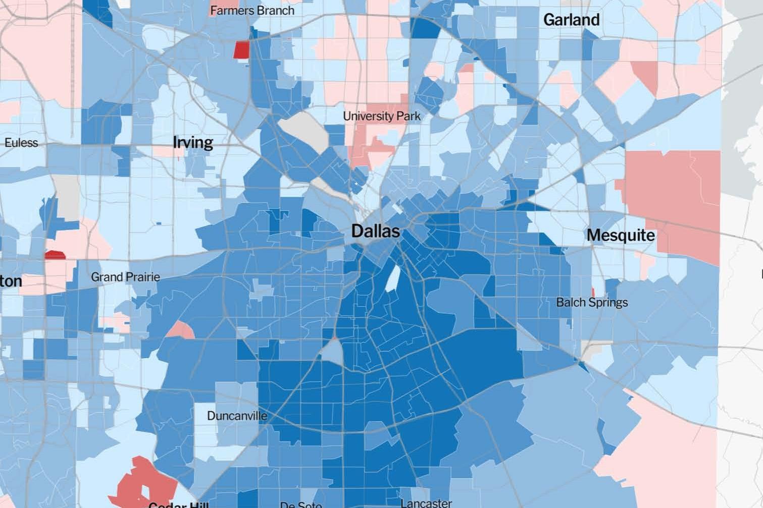 - Central Dallas: Younger, ethnically diverse voters largely backing Democrats.